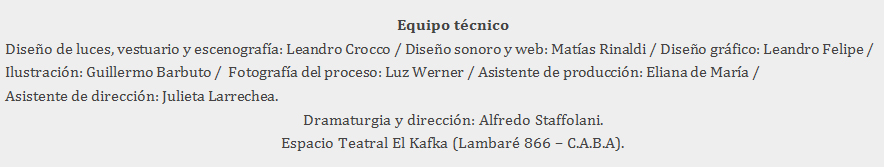 Esta tragicomedia, de un humor negro, por momentos, nos presenta a cuatro actores (Andrés Rossi —Andrés—, María Laura Santos —Alice—, Eduardo Peralta —el papá de Andrés—, Juan Manuel Castiglione —el portero del edificio— y Lizzi Argüelles —Isabel, la vendedora de parcelas—); que logran lucirse y transmitir: comicidad, odio, bronca, rencor, resentimiento, amor, pasión y dolor.