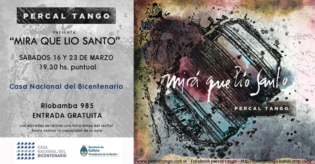 Percal Tango se presentará en la Casa Nacional del Bicentenario donde realizará un repertorio de clásicos del género y, además, temas del último disco del grupo: «Mirá qué lío Santo», que propone romper con la obsesión fusionista que caracteriza al último período musical de Buenos Aires, con obras propias y nuevas.