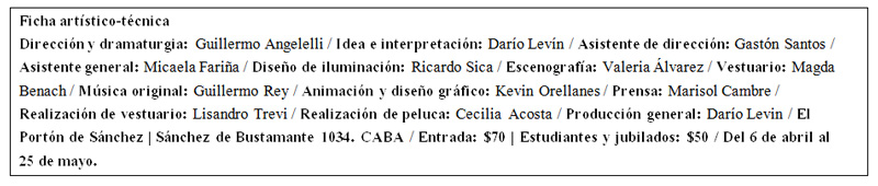 “Criatura de Dios”, es una pieza delicada, cuidada, en la cual Darío Levín protagoniza, se desenvuelve, emociona y no tiene intención de finalizar su narración. Este unipersonal clownesco es para observar y entregarse por completo sin prejuicios, sin fruncir el ceño. Debemos sentirnos libres al mirar a un actor que todo lo da, que no tiene miedos en sus venas, que es puro talento y vocación.
