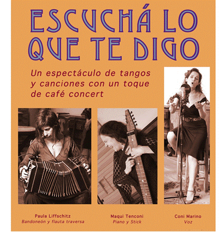 En estos tiempos de estridencias Paula Liffschitz, Coni Marino y Maqui Tenconi, te invitan a… “Escuchá lo que te digo”, que te habla bajito, que te tanguea suavemente al oído. Tres mujeres, que con cinco instrumentos, un toque de café concert, un toque de bodegón y un toque de refinamiento, como corresponde a tres minas finas, te dicen …“Escuchá lo que te digo”.