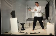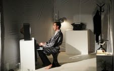 Una escenografía atractiva. Una especie de caja que oficia de hogar con muebles que ofician de muebles para ubicar los elementos tecnológicos que rodean a este hombre solo, peinado con gel y vestido con bata de seda.