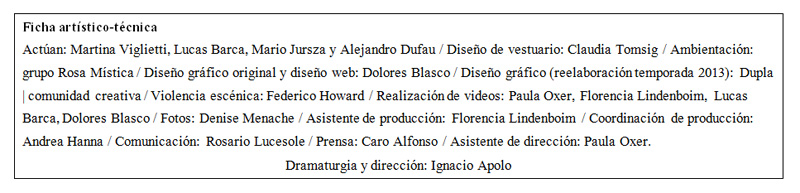 Claro que Lucas Barca –vestido con ropa no inflamable, en cierto momento- nos adentra en sus preocupaciones y Alejandro Dufau –personificado como un reo- también tienen historias por contar. Y para clarificar un poco el panorama, tendremos que estar muy atentos a cada intervención y no ponernos ansiosos con descubrir nada antes de tiempo ya que lo que interesa es estar atentos a la evolución de la dramaturgia.
