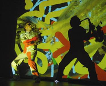 Sergio Dawi interactúa con un vestuario que le posibilita mimetizarse y ser parte de las imágenes proyectadas, sonorizando con su saxo, samplers y looperas.
