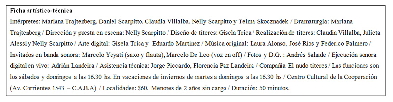 La belleza de los títeres, sus colores, la música que surge durante casi toda la obra, los diálogos y bailes; nos demuestran que sigue siendo posible entretener durante casi una hora a un público totalmente heterogéneo.