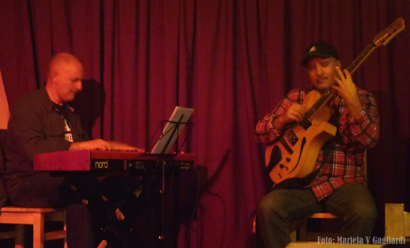 Las manos de Fernando parecían danzar al compás de la música. Sus ojos (entreabiertos) demostraban el compromiso y estado, al dejarse llevar por cada melodía interpretada en su teclado. A su vez, Juampy, también en trance; dejó que sus dedos rasgaran cada una de las cuerdas de su viola.
