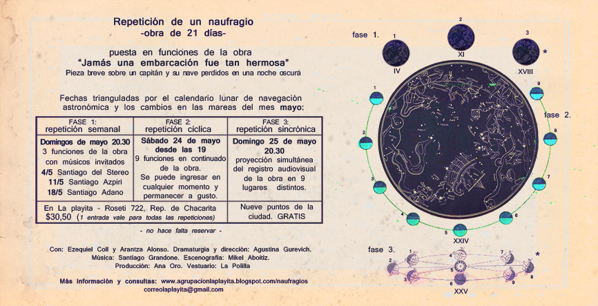 Sobre la obra: “Repetición de un naufragio” es una obra escénica que se extiende durante 21 días (del 4 al 25 de mayo), y consiste en una variedad de repeticiones de distinta naturaleza de una misma pieza teatral.