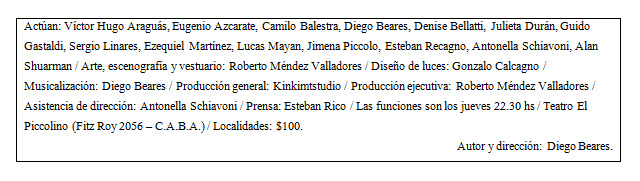 Me interesa mucho la puesta en escena ya que son solo unas sillas las encargadas de adornar el espacio y alojar a Beares, quien da la espalda a su platea hasta el final de la historia. Así como suele escucharse que un actor jamás debe dar su espalda al público, creo que habría que hacer una corrección: el elige hacerlo, no se confunde con la teoría.