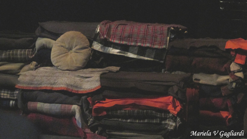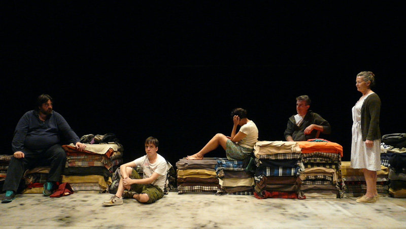 La casa nueva, conformada por un cuadrado -repleto de mantas cuadras y de diversos colores- incluirán a estos seres desposeídos de bondades. En un costado estará sentado durante casi toda la obra, un hombre (Gabo Correa), tildado de querer destruir lo que no existe. En algún momento ingresará para compartir con ellos su panorama y será echado a la fuerza. Él es diferente, como su hijo. Ambos son indefensos.
