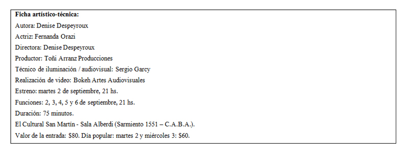 Fernanda Orazi se desenvuelve tan plenamente en el escenario que logra convencernos de cada uno de sus relatos y diálogos. Es ella misma quien interpreta a dos personajes y sincroniza los tiempos entre uno y otro. Sabemos que es una, pero desdoblada en dos, con vestimenta distinta, con voz diferente y hasta un modo de hablar particular.