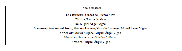 Óscar (de y dirigida por Miguel ángel Vigna) es una obra de títeres de mesa -con música en vivo- en la que un arquero es la figura principal. La sala del Celcit, nuevamente, fue el escenario para que este personaje deportivo pueda lucirse. Él formó parte de uno esos equipos que marcaron historia. Es reconocido, pero su vida actual se encuentra en decaimiento. Como todo ídolo, tuvo su momento de popularidad para, luego, caer en una adicción que lo ayude a sentir que el tiempo no pasó.