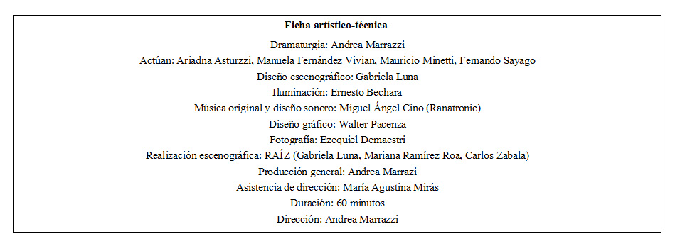 Son muchas las lecturas que se pueden hacer de esta pieza teatral que te hace pasar por diferentes situaciones, en tan solo una hora, y utilizando los cinco sentidos para oler la desgracia o intuir que algo malo se está por avecinar.