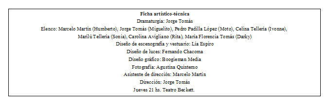 Hace dos años fui a ver “En otro vida fui Marlon Brando”, una obra que destacaba a personajes de William Shakespeare y en la que ocurrían otras acciones no esperadas por el espectador. Después de dicha pieza artística, Jorge Tomas doblega la apuesta y vuelve a escribir, protagonizar -esta vez- y dirigir una novedosa dramaturgia en la que, también, pasarán muchas cosas al mismo tiempo y la conclusión deberá ser sacada por cada persona -convirtiendo de este modo al espectador en activo-.
