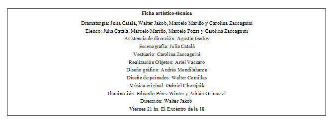 Esconderse en un baúl, desaparecer de la estratósfera, resurgir como ladrón y manipular todo lo necesario para que las cosas salgan como se quieren son algunas de las acciones que se vislumbran en esta pieza artística que dura una hora. Una hora en la que se resumen y representan características cotidianas, humanas y con las que, seguramente, muchos, podrán sentirse identificados.