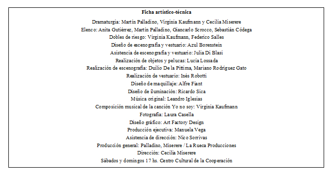Apoyándose en el género absurdo y el mundo clown, esta dramaturgia tiene la particularidad de repetir una misma escena -a la cual se le van sumando situaciones y herramientas- a lo largo de la historia que compone deleitosamente.