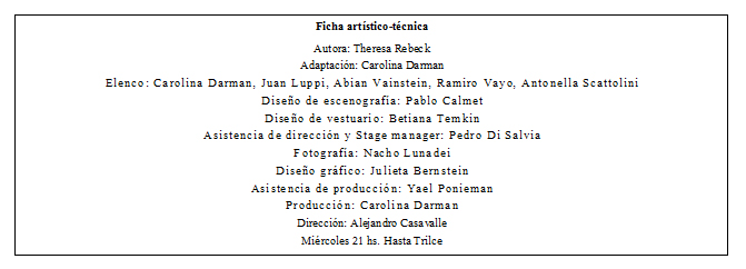 Carolina Darman, le otorga creatividad suprema a la pieza teatral, convirtiendo la novela dramática de Rebeck en acción, en una historia que mantiene la tensión en todo momento e interpretando a Jackie -quien intimida, propone y dispone de todo lo que se le presenta, manipulando la realidad a su antojo-.