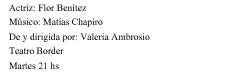 Flor Benítez es el nombre de la agraciada intérprete que representa a una mujer joven en busca de muchísimas cuestiones esenciales de la vida. Entonces puede notarse, a simple vista, cómo surge del interior de un piano de cola y empieza a mover, tan sutilmente, cada uno de los músculos hasta convertirse en quien desea ser.