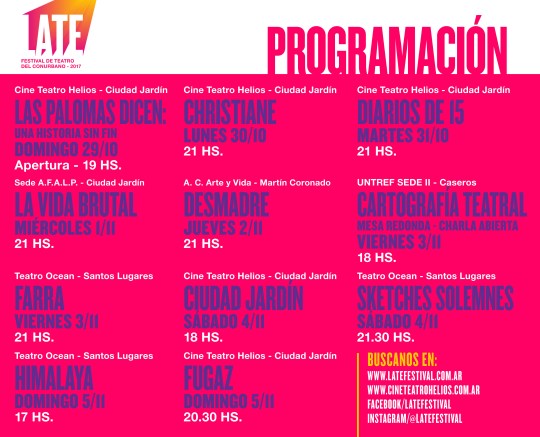 LATE es un festival de teatro independiente en el conurbano que se propone cruzar fronteras geográficas, estéticas y de contenidos. Lo dirige Gustavo Tarrío y busca generar un encuentro: acercar a los vecinos obras de teatro independiente de artistas reconocidos de CABA y GRAN BUENOS AIRES. Tendrá lugar del 29 de noviembre al 5 de octubre, en distintos espacios de la localidad de Tres de Febrero.
