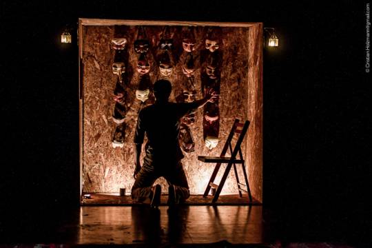 El actor toma una máscara, y comienza a desarrollar una escena. Al termino de esta toma otra mascara y desarrolla otra escena.