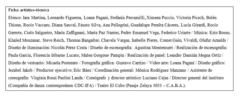 Acróbatas: Mariano Carneiro, Florencia Valeri, Rodrigo Oses, Cecilia «Mane» Stancato, Javier Davis, Camille Bastos, Clara Parada, Florencia Michalewicz, Marco Ingaramo y Esteban Trinda.
