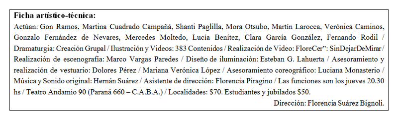 Idea, actuación y textos: Frida León Beraud. Dalang Puppencompany (Suiza), Dirección: Francisco Lumerman. Dramaturgia y traducción al alemán: Trix Bühler – Música: Simon Hostettler. Vídeo: Pablo Rodríguez Pandolfi – Folioscópio y dibujos: Basil Vogt – Diseño de luces: Ricardo Sica. Producción en Buenos Aires: Felicitas Luna. Asistencia técnica y de dirección: Ignacio Gracia. Vestuario: Fabiana Berghole. Producción en Suiza: Cristina Achermann