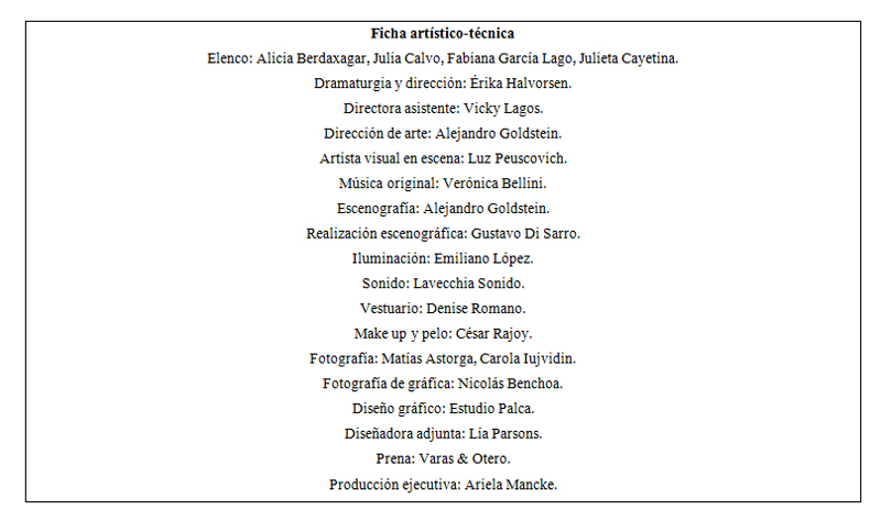 Contar con las anécdotas del escritor, finamente escogidas por Érika, conforman una pieza teatral muy interesante. Por un lado, las intérpretes leen su guión, nos miran, intentan convencernos. Cada una es una mujer diferente, que cambia al instante por otra. Batallas, guerras, anécdotas, romances, datos precisos y cronológicos, desfilan sin cesar durante la obra. A la vez que una artista visual (Luz Peuscovich), desenvuelve su talento, proyectando: recortes de diarios, titulares que resuman etapas importantes de la historia, detalles femeninos, fondos de colores, diferentes texturas y un universo que además de ambientar, le otorgan a la pieza teatral una impronta distinguida.