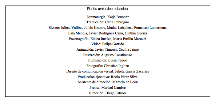 Idea, actuación y textos: Frida León Beraud. Dalang Puppencompany (Suiza), Dirección: Francisco Lumerman. Dramaturgia y traducción al alemán: Trix Bühler – Música: Simon Hostettler. Vídeo: Pablo Rodríguez Pandolfi – Folioscópio y dibujos: Basil Vogt – Diseño de luces: Ricardo Sica. Producción en Buenos Aires: Felicitas Luna. Asistencia técnica y de dirección: Ignacio Gracia. Vestuario: Fabiana Berghole. Producción en Suiza: Cristina Achermann