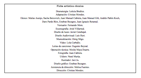 Inclusive la música en vivo junto a ciertos cantos invaden las escenas, permitiendo que la búsqueda de identidad sea el tema prioritario a desarrollarse. La mirada del público podrá, de repente, posicionarse en el centro del espacio escénico, los laterales, el fondo e inclusive en el cielo raso -en que transcurrirán unas proyecciones audiovisuales-.