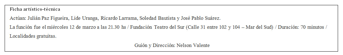 Actúan: Soledad Bautista, Gabriel Beck, Ricardo Larrama, José Pablo Suárez, Lide Uranga