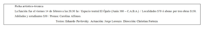 Desde un comienzo lo vemos al actor inquieto, haciendo una serie de movimientos repetitivos y coherentes con los que, luego, nos narrará. Él nos muestra cuál es su silla, qué lugar ocupa en su casa y en la vida. Qué rol, en definitiva, cumple en su familia. Después, nos da a conocer las características de su esposa y la fría relación que tienen hace tiempo. Lo mal y desolado que se siente, sobre todo, un día domingo como el que transcurre en la obra. Por último, le toca el turno a su hija. La única mujer de la casa que logra pintarle una sonrisa y la única que le da afecto.